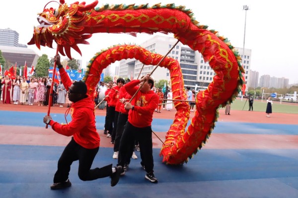 伴随着激昂的进行曲,重庆大学37个学院方阵各显神通,结合专业特色编排创意展演,将体育精神与中华优秀传统文化深度融合。美视电影学院方队将电影《哪吒》中振奋人心的经典台词与武术相融合,传统武术的刚柔之道被赋予新时代注解。体育学院方阵《青春塑形者》啦啦操以高难度空中踢板、后空翻、侧空翻等精湛技术惊艳全场,展现艺术与力量的完美结合。值得关注的是,留学中心国际学生方队创新演绎中国传统舞龙,鼓乐喧天中,展现了对中华传统文化的热爱与跨文化交流的蓬勃生命力,成为开幕式上最具“破圈”效应的文化互鉴亮点。
