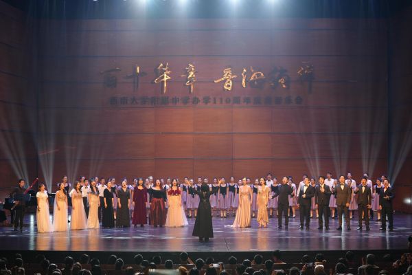 2024年10月31日晚,一首恢宏磅礴的民乐合奏在重庆大剧院的舞台上响起,正式拉开了西南大学附属中学(以下简称“西南大学附中”)办学110周年庆典音乐会的序幕,来自该学校合羽国乐团、星辉交响乐团、春之声合唱团、春之韵舞蹈团、星漾舞蹈团的学子们,为千余名观众上演了一场令人难忘的音乐盛宴,献礼学校办学110周年。