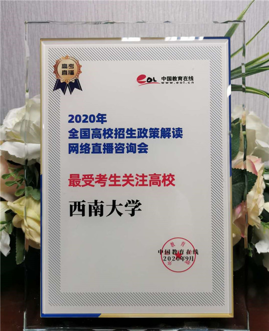 在评选中,西南大学凭借高人气,在近500所高校中脱颖而出,获得“最受考生关注高校”殊荣。这一奖项的获奖高校,立足直播特点,结合本校特色,以交互式的直播形式给考生和家长耳目一新的体验,收获了最高观看热度与最多观看人数。