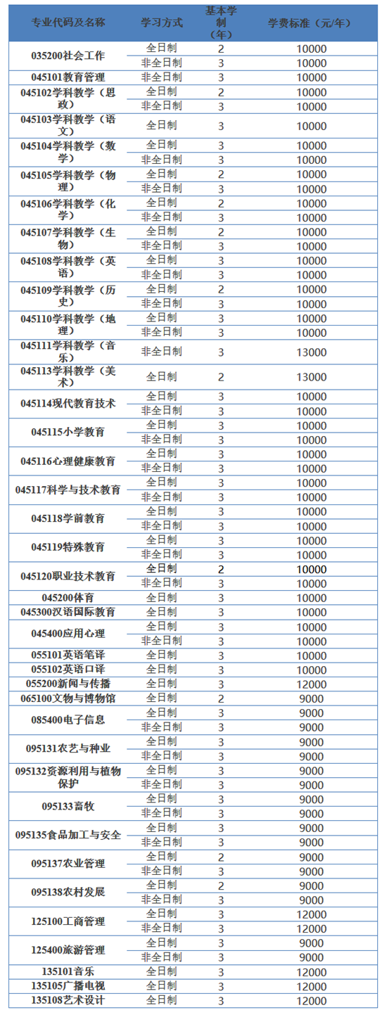 表1.重庆师范大学专业学位硕士研究生基本学制、学习形式及学费标准