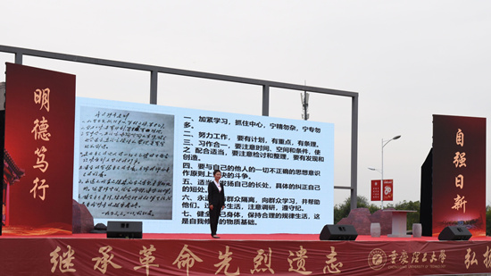 “作为有着鲜明红色基因和深厚家国情怀的重庆理工大学,从2019年开始与红岩联线文化发展中心联合打造了校园思想政治教育基地,以主色调、主旋律、好声音、正能量教育师生,并取得了良好的育人成效。”康骞书记还表示,希望全体同学弘扬“明德笃行,自强日新”的校训精神,在红岩革命精神和学校红色基因的浸润下,努力成长为堪当大任的时代新人。