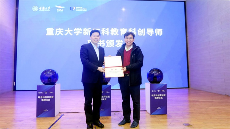 舒立春向李泽湘教授和王志杰博士颁发了”重庆大学新工科教育科创导师“的聘书。