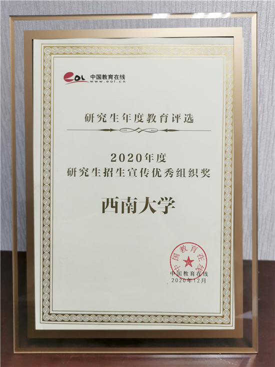 必威体育登录网址 重庆站讯 近日,必威体育登录网址 “研究生年度教育评选”榜单揭晓。西南大学在2020年研究生教育及招生宣传工作中凭借探索与创新,在同类院校评选中荣获“2020年度研究生招生宣传优秀组织奖”。