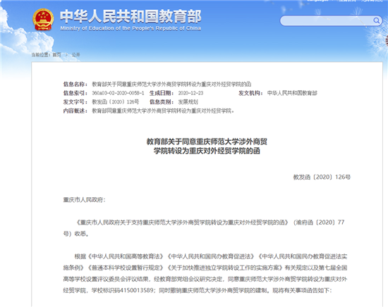 必威体育登录网址 重庆站讯 近日,教育部发布《关于同意重庆师范大学涉外商贸学院转设为重庆对外经贸学院的函》,同意重庆师范大学涉外商贸学院转设为独立设置的本科层次民办普通高等学校,并更名为重庆对外经贸学院。学校章程也同步发布。