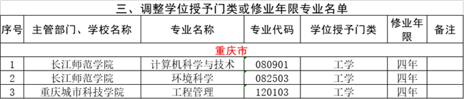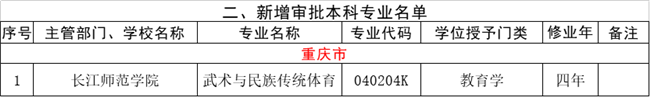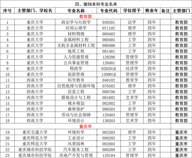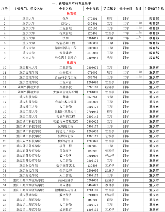 重庆市部分高校本科专业目录进行更新。其中,新增备案本科专业39项,新增审批本科专业1项,调整学位授予门类或修业年限专业3项,撤销本科专业23项。名单如下: