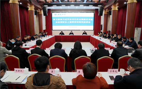 3月3日下午,西南大学召开学习贯彻习近平总书记在全国脱贫攻坚总结表彰大会上重要讲话精神座谈会。西南大学党委书记李旭锋,党委副书记潘洵,副校长赵国华出席会议,学校相关单位负责人、专家代表、扶贫挂职干部代表、学生代表等参会。会议由赵国华主持。