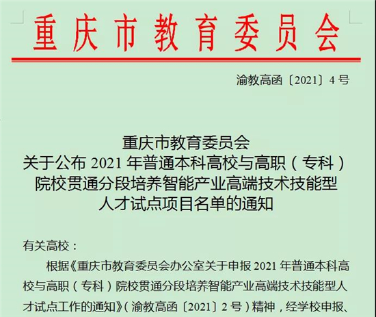2月2日,重庆市教委公布了2021年度重庆市普通本科高校与高职(专科)院校贯通分段培养智能产业高端技术技能型人才试点项目名单。重庆移通学院6个专业获批2021年普通本科高校与高职院校贯通分段培养,招生计划540人。衔接院校与专业分别为:重庆移通学院轨道交通信号与控制、机械设计制造及其自动化专业对接重庆公共运输职业学院铁道信号自动控制、机械制造与自动化专业;重庆移通学院软件工程专业对接重庆信息技术职业学院软件技术专业;重庆移通学院通信工程专业对接重庆航天职业技术学院通信技术专业;重庆移通学院电气工程及其自动化专业对接重庆科创职业学院电气自动化技术专业;重庆移通学院物联网工程专业对接重庆能源职业学院物联网应用技术专业。