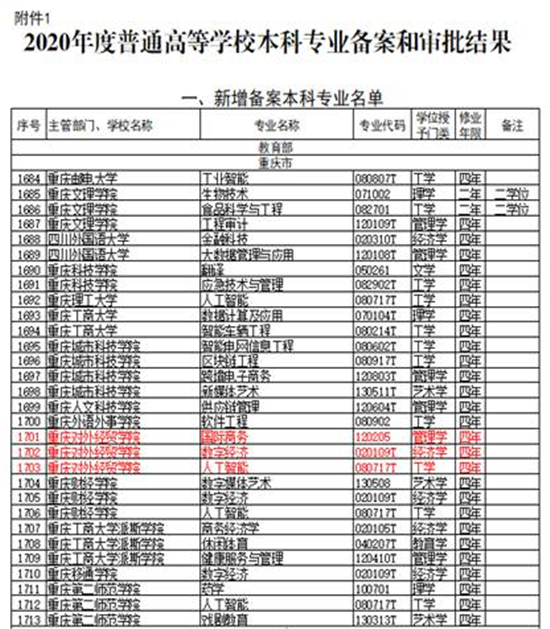 近期,教育部下发了《关于公布2020年度普通高等学校本科专业备案和审批结果的通知》(教高函〔2021〕1号),重庆对外经贸学院(原重庆师范大学涉外商贸学院)申报的“数字经济”、 “国际商务”、“人工智能”三个本科专业全部成功获批,并从2021年开始招生。