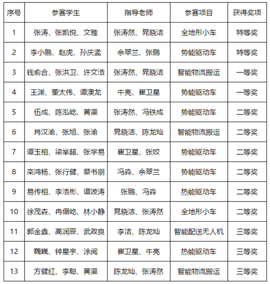 全国大学生工程训练综合能力竞赛是教育部高等教育司主办、教育部工程训练教学指导委员会举办的全国性大学生科技创新实践竞赛活动。此次大赛重庆移通学院共派出13支队伍、参与了势能驱动车、热能驱动车、智能物流搬运、智能配送无人机和全地形小车5个赛项。经过2天的激烈比拼,重庆移通学院13支队伍中,斩获特等奖2项:其中全地形获得重庆赛区全地形组第一名为唯一的特等奖、势能车在47支队伍中脱颖而出排名第二,获得重庆赛区势能驱动车组特等奖;其他队伍获得一等奖2项;二等奖6项和三等奖3项!创下自参加该竞赛以来重庆移通学院学子在教育部重点打造的三个大赛中的最好成绩。另外,重庆移通学院获评“优秀组织奖”,智能工程学院张涛然和余翠兰两位老师获评“优秀指导教师”荣誉称号。