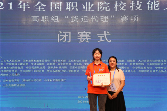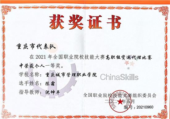 2021年6月12日,2021年全国职业院校技能大赛高职组“货运代理”赛项在山东交通职业学院成功举办。重庆城市管理职业学院学生陈霜在沈坤平老师的指导下,凭借过硬的专业能力和水平,沉着应对,经过2天竞技比拼,获得该赛项个人一等奖。值得一提的是,这也是继2020年全国职业院校技能大赛改革试点赛之后再次蝉联该赛项一等奖。充分展示了重庆城市管理职业学院综合办学成果和该校在关务与外贸服务专业及货运代理职教领域的实力。