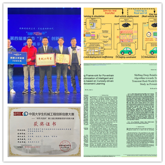 在科研方面。深度学习实验室在胡博老师指导下,以深度强化学习相关应用为驱动,跨界融合、精准培养,积极组织学生参加相关科技竞赛、国际国内学术交流与学术会议,构建教学、科研、实验室三位一体建设格局,全面实现科教融合,并取得较好成果。2019年获评第四届重庆市“五小”创新晒成果活动“青创工作室”,是本届大赛唯一获此殊荣的高校队伍。实验室本科生李家曦等同学发表SCI期刊论文7篇,其中SCI一区TOP期刊论文3篇;研究生/本科生参加车辆领域高水平会议5次,其中获得优秀论文奖3项;实验室获得2021年中国大学生机械工程创新创意大赛三等奖、2020年中国大学生机械工程创新创意大赛二等奖、第十七届“挑战杯”全国大学生课外学术科技作品竞赛重庆市选拔赛二等奖。