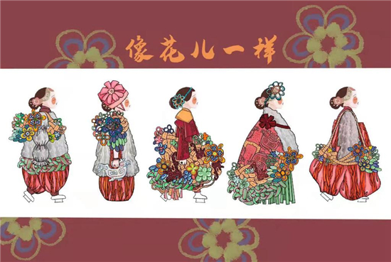 设计理念:以清朝女性的主要服饰为原型,改良成具有现代审美的设计。运用了青铜器的纹样,加入各种交叠的花朵图样,象征着新一代的儿童像花一样开放成长,继续传承我们的文化。