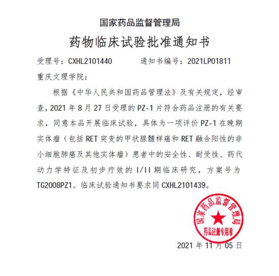 近日,重庆文理学院药学院(创新靶向药物国际研究院)最新研发的抗癌新药PZ-1片获得国家药品监督管理局颁发的一类药物临床试验批件(批件号:2021LP01810,2021LP01811)。