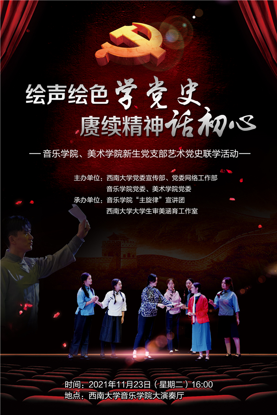 11月23日下午,在“11.27大屠杀”纪念日72周年即将来临之际,一场别开生面的艺术党史学习教育在西南大学音乐厅拉开帷幕。这场名为“绘声绘色学党史,赓续精神话初心”的主题党史学习教育由西南大学党委宣传部、党委网络工作部,音乐学院党委,美术学院党委主办,音乐学院主旋律宣讲团、西南大学大学生审美涵育工作室承办。通过“唱英烈、画英烈、学英烈”的方式致敬革命英烈,赓续革命精神,坚定共产党人的初心信念。