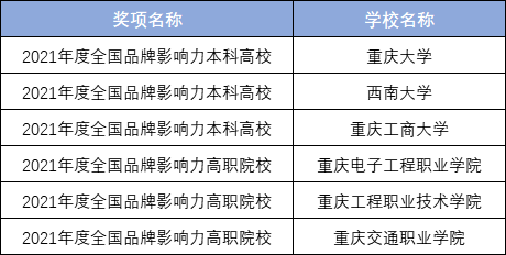 “2021年度全国品牌影响力高校”是根据2021年度掌上高考全国高校招生数据库,高招智能问答系统、智能电话系统的搜索频次、页面访问量、电话咨询量等数据,以及来自微信、微博、抖音等第三方平台上的曝光量数据等分别加权赋分统计得出,分为本科高校榜和高职院校榜两个子奖项。重庆市6所高校获此称号,分别是重庆大学、西南大学、重庆工商大学、重庆电子工程职业学院、重庆工程职业技术学院、重庆交通职业学院。
