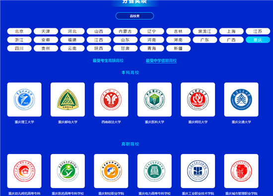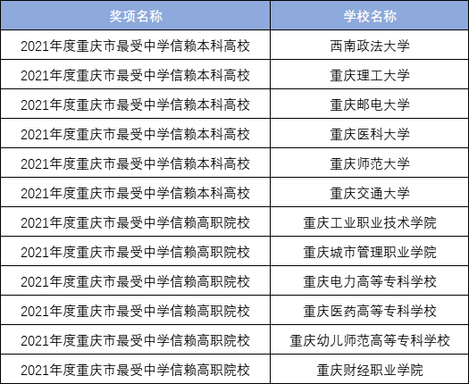 “2021年度最受中学信赖高校”主要评价各个中学教师群体对于高校及其专业的了解、熟悉、认可程度。本榜单通过对掌上高考各类高校招生信息系统中高中教师用户搜索和互动数据进行加权核算,并结合对高中校长、老师问卷调查、调研情况,最终评选出各省(市/自治区)2021年度最受中学信赖高校(本科/高职)榜单。重庆市共12所高校获此称号,分别是西南政法大学、重庆理工大学、重庆邮电大学、重庆医科大学、重庆师范大学、重庆交通大学、重庆工业职业技术学院、重庆城市管理职业学院、重庆电力高等专科学校、重庆医药高等专科学校、重庆幼儿师范高等专科学校、重庆财经职业学院。