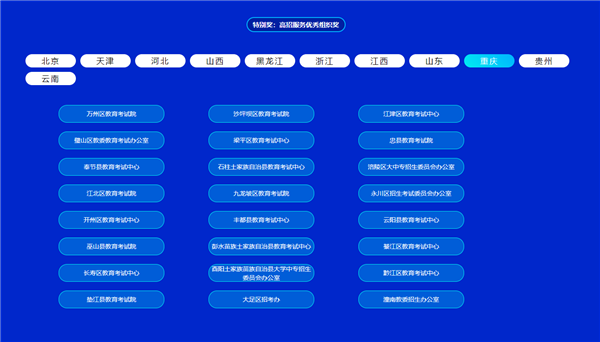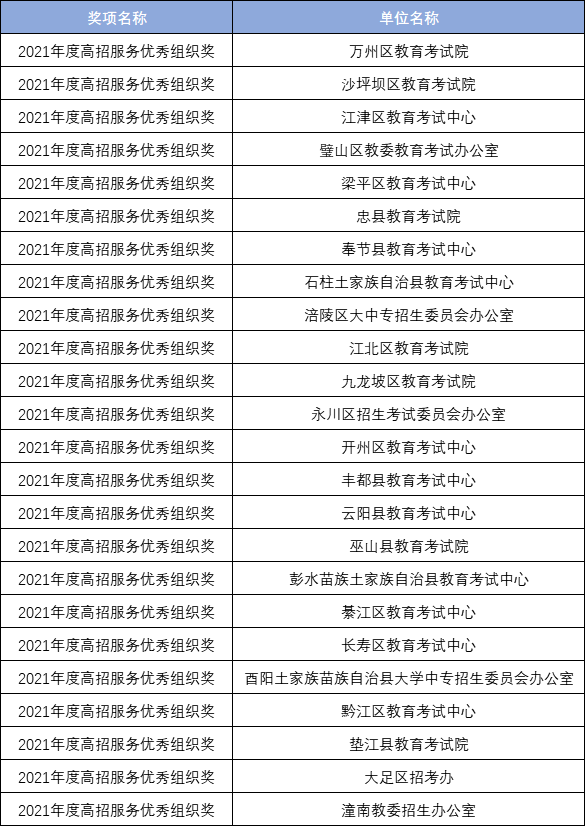 “2021年度高招服务优秀组织奖”是基于2021年高考期间,全国各教育招生考试主管部门组织开展线上线下各类高招咨询会情况,以及充分利用智能问答及智能电话系统为考生提供优质高效服务方面。同时结合考生参与活动积极性,咨询服务满意度等方面综合评分,最终评选出“2021年度高招服务优秀组织奖”。重庆市共24个教育招生考试主管部门获此称号,获奖名单如下。