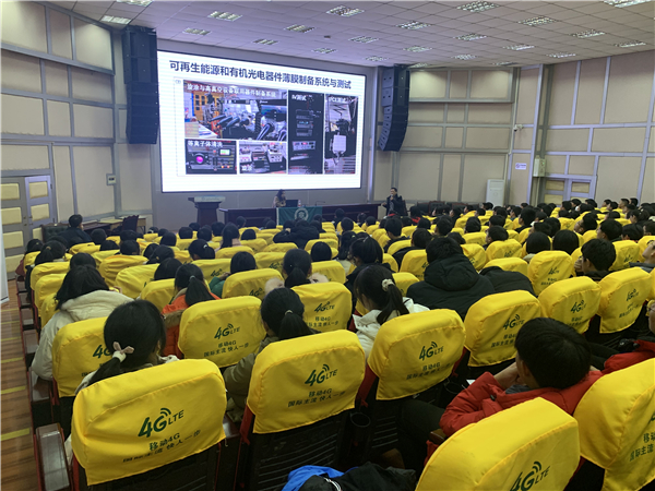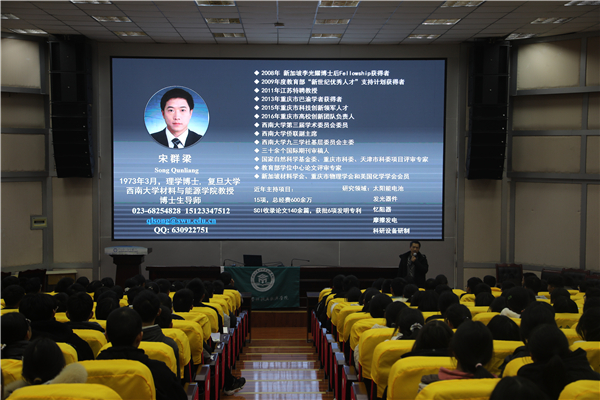 活动上,宋群梁教授以“天生我‘材’,筑梦未来——我的能源之路”为题,对西南大学及材料与能源学院进行了简单介绍,随后就个人经历展开“能源之路”的阐述。“能源是人类文明的基石,材料改变了人类文明的进程。”宋群梁教授介绍道,从石制工具开启人类文明,到钢铁推动第一次工业革命,再到硅半导体将人类社会带入信息时代,材料的发展推动人类文明不断进步。然后,他以能源安全的维护和代价引出能源的重要性,对地球变暖、清洁能源与可再生能源及太阳能等展开详细讲解。最后,他与在场学生探讨科学与艺术,强调认识世界、认识未来的重要性,激励大家规划自己的人生、道路。