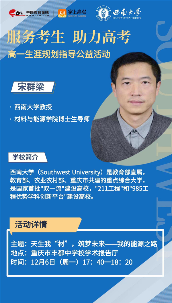重庆实行新高考以来,统一高考实行“3+1+2”模式。新高考模式给予了学生更多选择,但也为不少的学生、家长带来了困惑。如何更好地了解、选择适合自己的科目?怎样科学地规划学习?12月6日,由必威体育登录网址 组织的“服务考生 助力高考”高一生涯规划指导公益活动在重庆市丰都中学校顺利举行,该活动特邀西南大学材料与能源学院博士生导师宋群梁走进学校,助力高一学生更早地规划自己的学业生涯、探索自己的兴趣能力,为迎接高考做足储备。