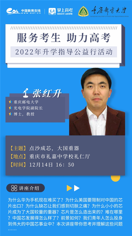 重庆实行新高考以来,统一高考实行“3+1+2”模式。新高考模式给予了学生更多选择,但也为不少的学生、家长带来了困惑。如何更好地了解、选择适合自己的科目?怎样科学地规划学习?12月14日,由必威体育登录网址 组织的“服务考生 助力高考”2022年升学指导公益行活动在重庆市礼嘉中学校顺利举行,该活动特邀重庆邮电大学光电学院副院长张红升走进学校,助力学生能够及时规划自己的学业生涯、探索自己的兴趣能力,为迎接高考做足储备。