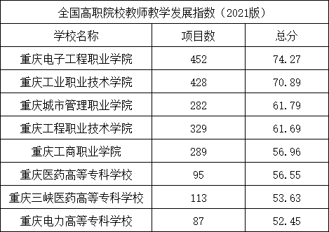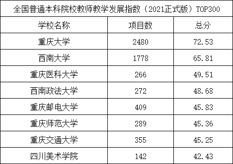 12月22日,中国高等教育学会在线发布“2021版全国普通高校教师教学发展指数”。其中公布了全国普通本科院校教师教学发展指数(2021版)TOP300与全国高职院校教师教学发展指数(2021版)TOP300,重庆16所高校名列其中。本科院校分别是重庆大学、西南大学、重庆医科大学、西南政法大学、重庆邮电大学、重庆师范大学、重庆交通大学、四川美术学院,高职院校分别是重庆电子工程职业学院、重庆工业职业技术学院、重庆城市管理职业学院、重庆工程职业技术学院、重庆工商职业学院、重庆医药高等专科学校、重庆三峡医药高等专科学校、重庆电力高等专科学校。