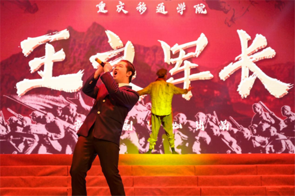移通学院优秀毕业生陈治霖、刘朝晖现场演唱《王良军长》宣传曲目,获现场观众热烈掌声。音乐剧《王良军长》作为学校音乐剧中心成立后首部打造的原创音乐剧项目,以重庆綦江革命英雄人物王良为原型,讲述了红军将领王良同志从“投身黄埔”到“参加革命”,再到“屡建功绩”的传奇故事。宣传曲目的作曲、编曲、作词均由移通师生共同完成。