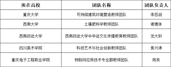 近日,教育部公示了第二批“全国高校黄大年式教师团队”认定结果,共有来自全国200所高校的200个团队入选。重庆6所高校的6个团队名列其中,分别是重庆大学的可持续建筑环境营造教师团队、西南大学的土壤肥料学教师团队、西南政法大学中华法文化传播教育教师团队、四川美术学院的科技艺术与社会创新教师团队、重庆电子工程职业学院的物联网应用技术专业群教师团队。
