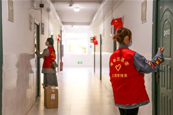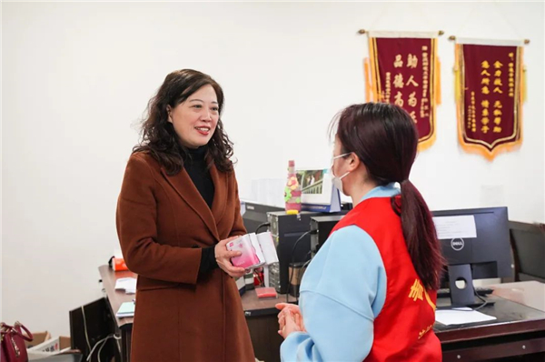 “咚咚咚,咚咚。”伴着敲门声随之而来的是拖鞋的嘀嗒声,“咔嚓”一声,门开了,志愿者们笑容满面地送上了一份特殊的礼物,“妇女节快乐,这是送给你们的卫生巾。”