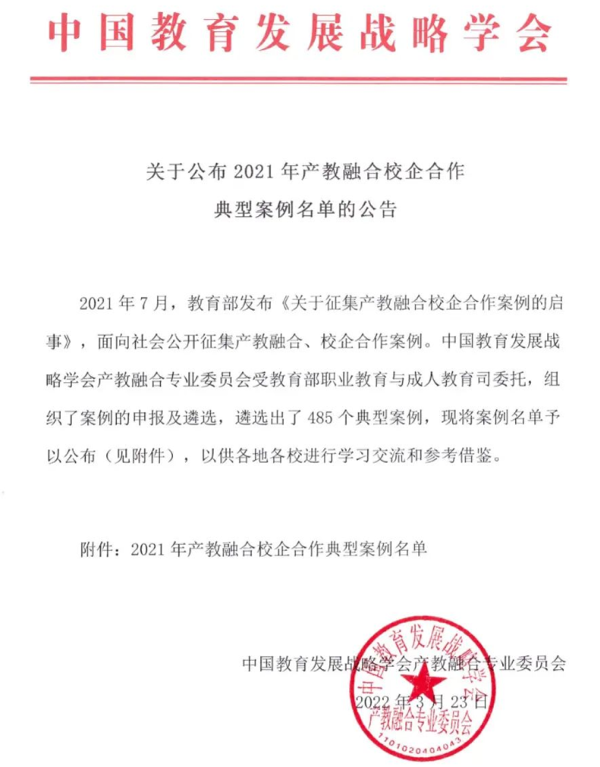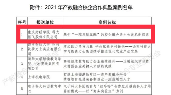 近日,中国教育发展战略学会产教融合专业委员会受教育部职业教育与成人教育司委托,发布了《关于公布2021年产教融合校企合作典型案例名单的公告》,由重庆财经学院与科大讯飞股份有限公司共建的现代产业学院——讯飞人工智能学院组织申报、学校审核推荐的《基于“一院三制五融”的校企融合共生长效机制探索》作为典型案例成功入选,在全部485个案例中位列第1。