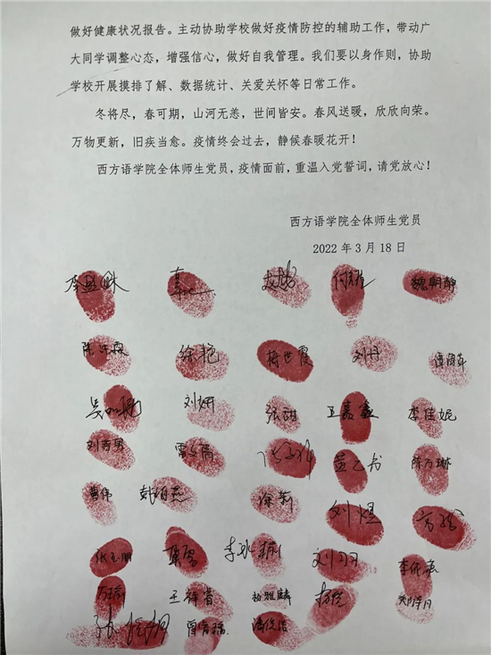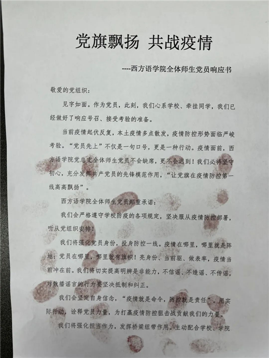 西方语学院党总支师生党员共书“党旗飘扬,共战疫情”响应书,在党旗下重温入党誓词,请党放心,抗疫有我!