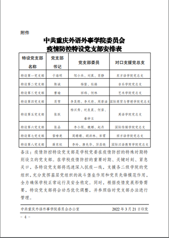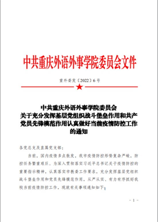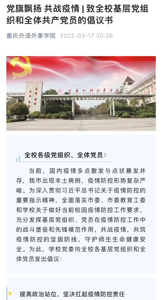 疫情就是命令,防控就是责任。目前国内疫情多点散发,重庆市疫情防控形势复杂严峻。自重庆高校突发疫情以来,重庆外语外事学院在校党委和行政的正确领导下,各级党组织和广大党员干部认真学习贯彻习近平总书记关于疫情防控的重要指示精神,认真贯彻落实市委及市委教育工委的安排部署,在校园筑牢疫情防控安全线,充分发挥基层党组织战斗堡垒作用和党员干部先锋模范作用,全力守护师生的生命安全和身心健康。