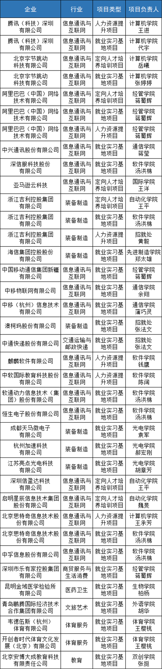 重庆邮电大学由分管校领导牵头组织,招就处、教务处及各学院协同参与、通力合作、主动出击,与腾讯(科技)深圳有限公司、北京字节跳动科技有限公司、阿里巴巴(中国)网络技术有限公司、中兴通讯股份有限公司、深信服科技股份有限公司、亚马逊云科技、浙江吉利控股集团有限公司、海信集团控股股份有限公司、中国移动通信集团新疆有限公司、中移物联网有限公司、中移(杭州)信息技术有限公司等优质企业达成37个合作项目并获准立项(详细名单请见附表),立项数量位列全国高校第11位。