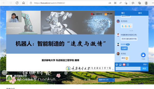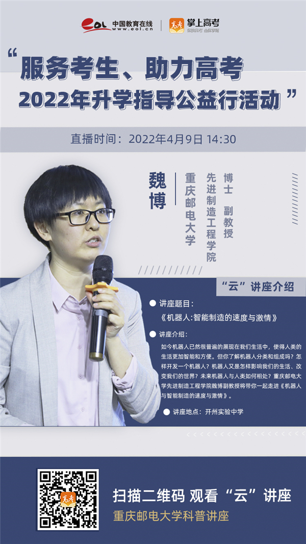 你了解机器人分类和组成吗?怎样开发一个机器人?机器人又是怎样影响我们的生活、改变我们的世界?未来机器人与人类如何相处?4月9日,重庆邮电大学先进制造工程学院魏博副教授通过线上直播带领重庆市开州实验中学学子一起走进《机器人:智能制造的速度与激情》。