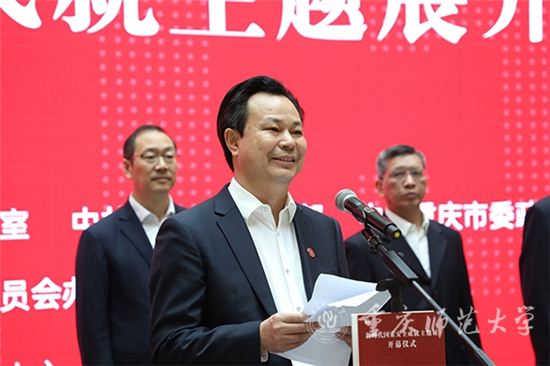 “今年的4月15日是第七个全民国家安全教育日,2022年是党的第二十次全国代表大会召开之年。”校党委书记曾礼在开幕式上简要介绍了学校近年来开展的国家安全日教育活动以及此次主题展的背景与布展情况。他谈到,学校历来高度重视“总体国家安全观”教育,依托教育部高校思想政治工作创新发展中心扎实开展大学生国家安全教育。一是在市委国安办、市委宣传部、市教委等部门的支持指导下,树立大思政观念,把国家安全教育、思想政治教育、专业科学教育三者有机融和,把显性教育和隐性教育统一起来,内化思想引领,强化国家安全意识。二是通过举办国家安全教育教学风采展示大赛、国家安全教育思政公开课等活动,采用情景对话、讲述诵读、青春歌舞、情景演绎、多媒体技术等新颖形式,每年坚持开展国家安全主题宣传教育。三是深化教育培训,以庆祝中国共产党建党100周年活动、“党史资源+沉浸式教学”“国培计划”等形式,聚焦载体融入、聚力路径创新、聚效质量增强,引导广大师生增强“四个意识”、坚定“四个自信”,提升维护国家安全能力。四是开展专题研究,就重庆市国家安全教育基地建设情况开展了课题研究,形成了调研报告,并提出了重庆市国家安全教育基地建设的思路及建议。