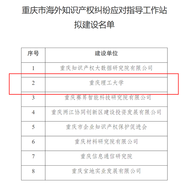 为深入推进营商环境创新试点工作,指导重庆市企业有效应对海外知识产权纠纷,强化海外知识产权维权协作,提升海外知识产权风险防控和纠纷应对能力,重庆市知识产权局于4月14日发布了《重庆市海外知识产权纠纷应对指导工作站拟建设名单》,重庆理工大学作为重庆市唯一一所高校成功入选。