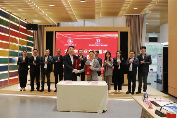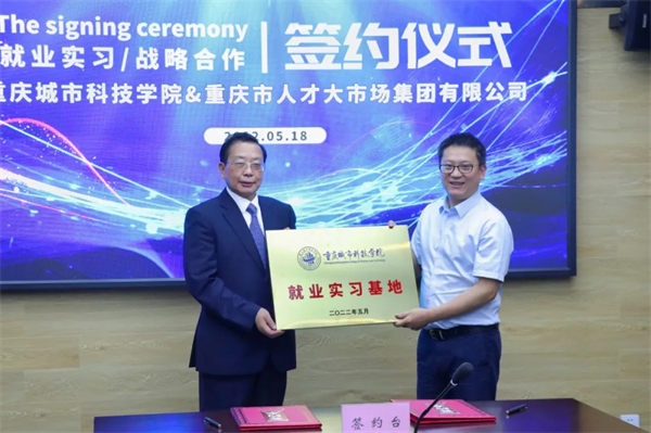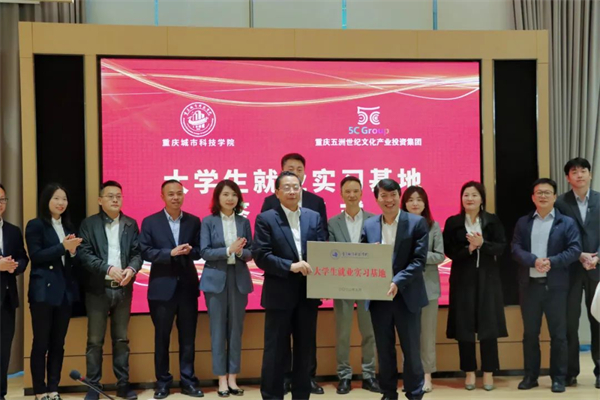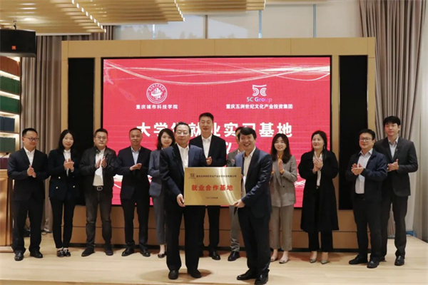 副校长郭建礼与重庆五洲世纪文化传媒有限公司新技术中心总监兼教育科技公司总经理张乾明代表校企双方签订了《大学生就业实习基地合作协议》,校长杨天怡与公司董事长徐登权进行了就业实习基地、就业合作基地的授牌仪式。