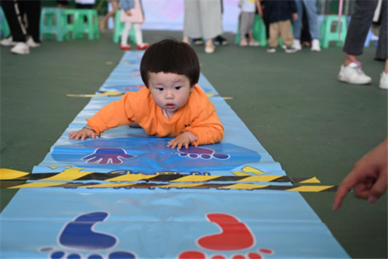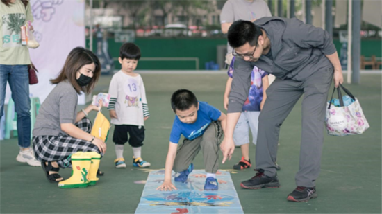 紧接着,“手忙脚乱”热身游戏掀起现场一片热浪。小朋友们跟随图样将自己的脚印、手掌印在童趣满满的喷绘图上,并一步一步向站在终点的爸爸妈妈走去。