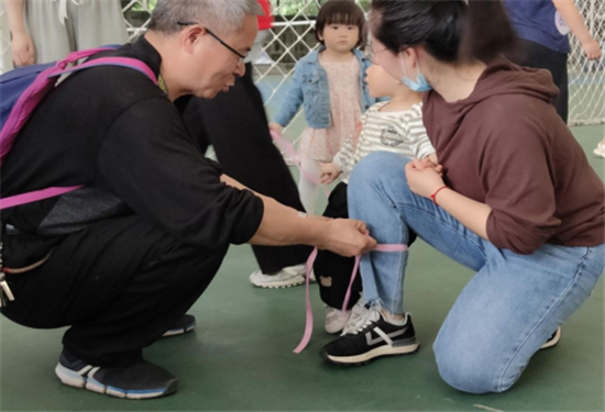 到达终点后,他们便来到了第二关“两人三足”。小朋友与爸爸或妈妈团结协作,两人并排站立,双方各出左脚和右脚绑在一起,从起点处出发,到标记点折返到达终点即为通关成功。这项活动中,参与者们都体验到齐心协力合作后带来的快乐。