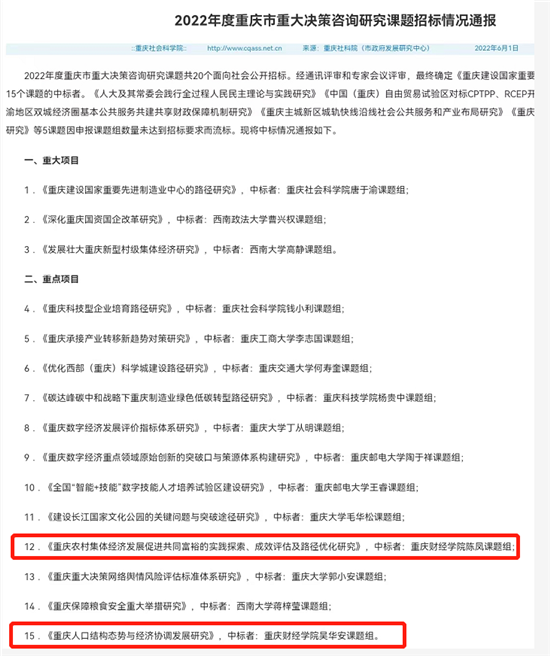 6月1日,重庆市人民政府发展研究中心发布《2022年度重庆市重大决策咨询研究课题招标情况通报》,重庆财经学院吴华安教授课题组的《重庆人口结构态势与经济协调发展研究》和陈凤老师课题组的《重庆农村集体经济发展促进共同富裕的实践探索、成效评估及路径优化研究》中标。