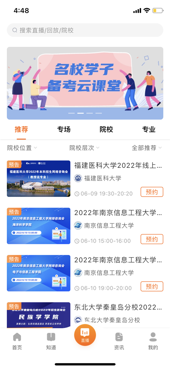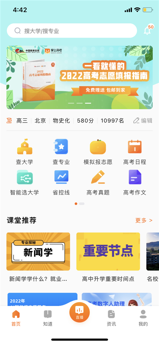 掌上高考APP通过由等参与的全年千余场次直播活动,为考生带来权威的高校招生政策解读、专业的学科讲解、有效的备考经验分享,让你足不出户了解院校,轻松报考!