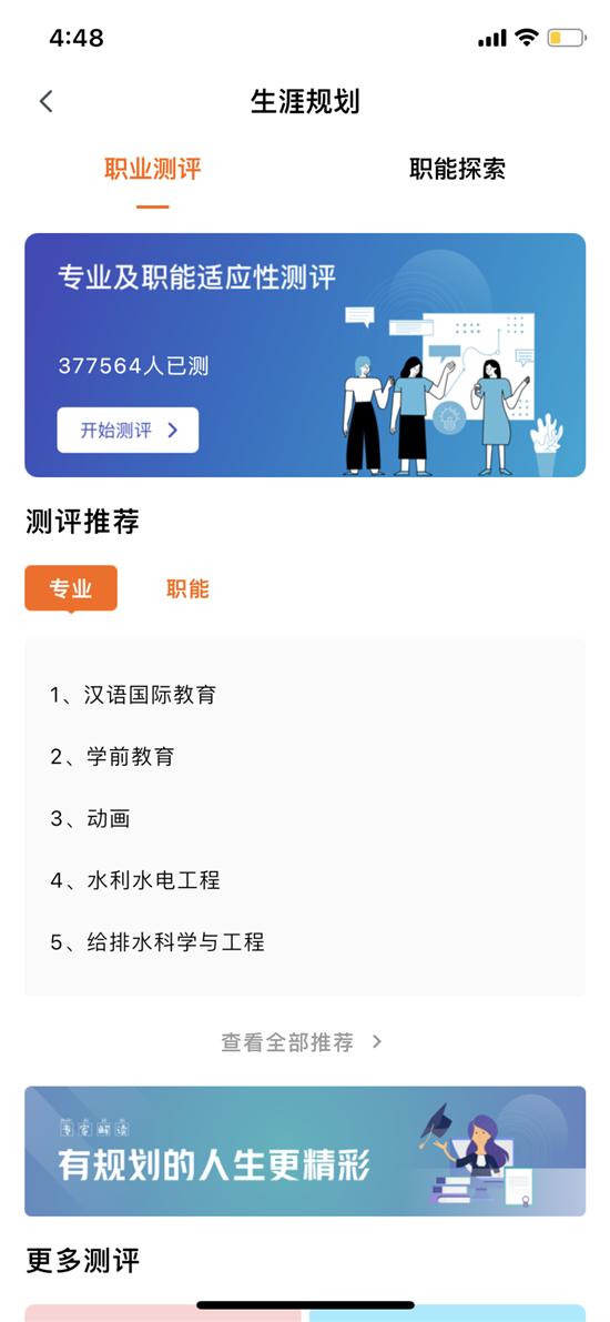 为帮助高考生做好,掌上高考APP生涯规划功能采用国际化的专业测评,帮你多维度认知自己,考生经过测试后会获得专业测评报告,此报告能够辅助考生选取与本人兴趣、性格相匹配的专业方向,让考生在面对生涯规划时不再迷茫。