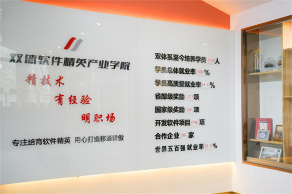 截至2022年5月,学校双体软件精英产业学院建立了80余家稳定的实战案例来源企业和就业基地,学员自主开发软件700余项,获省部级、国家级奖励300余项,总体毕业去向落实率100%,高质量毕业去向落实率83.6%,世界500强毕业去向落实率达13.9%。2021年近20名学员初次就业年薪20万以上,最高年薪达40万。曾有6名学员入职同一公司,工作仅百日全部提升为管理干部。其中十三期学员李阳作为国家嫦娥探月工程软件项目组成员得到中国科学院的表彰与嘉奖。