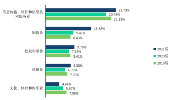 近年来,学校毕业生的就业行业分布较为广泛,覆盖了“信息传输、软件和信息技术服务业”、“制造业”、“批发和零售业”、“建筑业”、“文化、体育和娱乐业”等多个行业,其中“信息传输、软件和信息技术服务业”领域为近三届毕业生主要的就业行业选择,占比均处于 20.00%以上。学校的办学特色和专业优势为当地经济的发展培养了大量数字经济时代高情商经营管理人才。第三方机构数据显示,毕业生对学校总体满意度、用人单位对本校毕业生工作表现满意度均呈现高值,学校就业质量获得学生、社会高度认可。
