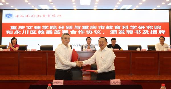 黄伟九代表学校与重庆市教育科学研究院签署卓越教师联合培养战略合作协议,漆新贵代表学校与永川区教育委员会签署联合开展卓越班研学合作协议。签约后,与会领导为永川区教育委员会教研员、名师工作室主持人代表分别颁发兼职研学导师证书及研学基地牌匾。