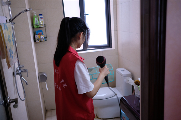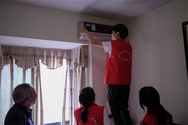 另一边,空调清洗小分队的学生志愿者们也在负责人员的统一安排下,结对组合,前往离退休教师们家中。空调断电、扶稳椅子、拆卸外壳、抽出滤网、清洗滤网……志愿者们互帮互助,将滤网清洗干净,圆满完成了清洗任务。
