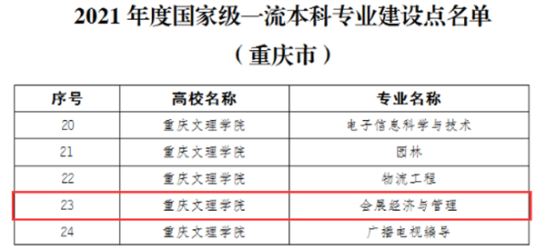 近日,教育部办公厅印发了《关于公布2021年度国家级和省级一流本科专业建设点名单的通知》(教高厅函〔2022〕14号),重庆文理学院会展经济与管理专业被认定为国家级一流本科专业建设点。该校凭借多年办学积淀,专业建设实现历史性突破,会展经济与管理专业成功入选国家级一流本科专业建设点,成为重庆市第一个、也是唯一一个获批为国家级一流本科专业建设点的会展类专业。