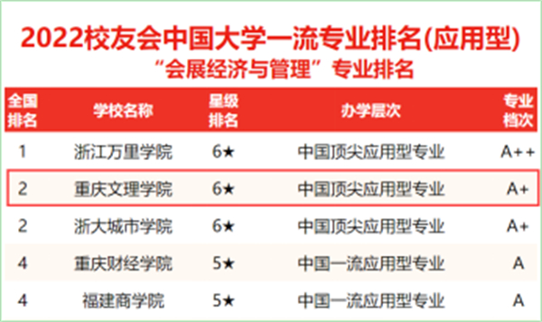 重庆文理学院是西部地区第一个开办会展本科教育的院校(2004年),2008年,会展经济与管理专业成为学校首批特色专业,2015年获批重庆市“三特行动计划”特色专业,2019年获批重庆市级一流专业立项建设项目,2020年获批国家“双万计划”省级一流专业建设点。2022校友会中国大学一流专业排名(应用型),该校会展经济与管理专业星级排名6★,办学层次为“中国顶尖应用型专业”,专业档次为A+。