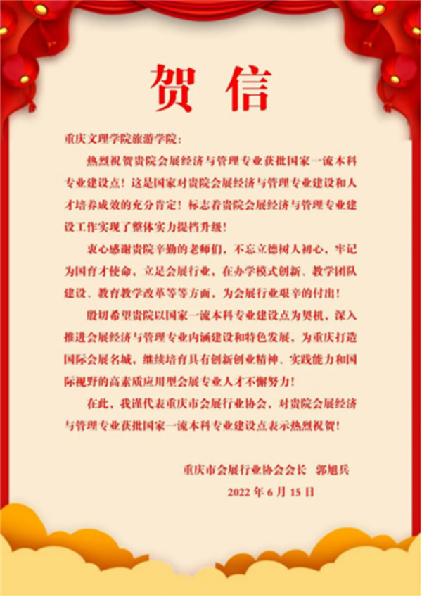 重庆市会展行业协会会长、重庆西部展览策划有限公司执行董事郭旭兵先生专门发来贺信,祝贺会展经济与管理专业获批国家一流本科专业建设点。