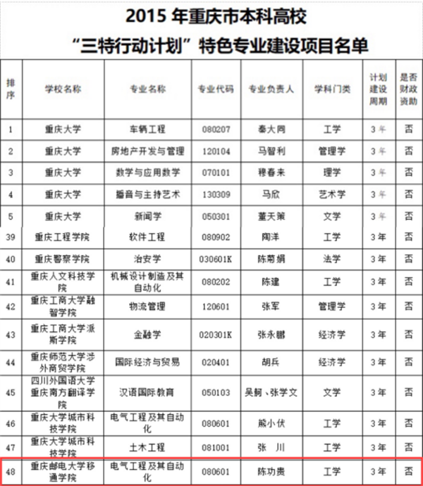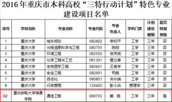 重庆市“三特行动计划”特色专业-通信工程专业、网络工程专业、电子信息工程专业、电气工程及其自动化专业、重庆市大数据智能化类特色专业-信息管理与信息系统、物联网工程专业通过市教委验收。同时信息管理与信息系统获批重庆市2019年本科高校一流专业立项建设、通信工程专业获批重庆市2021年市级一流本科专业建设试点。