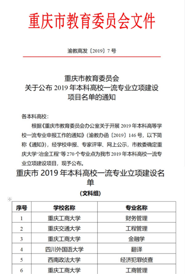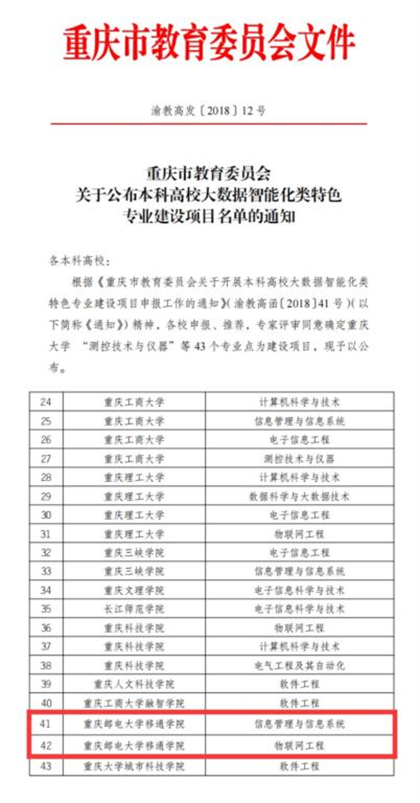 根据渝教高发〔2018〕12 号文件,学校信息管理与信息系统专业、物联网工程专业,在2018年重庆市教育委员会关于公布本科高校大数据智能化类特色专业建设项目名单的通知中获专家评审同意确定为重庆市本科高校大数据智能化类特色专业。